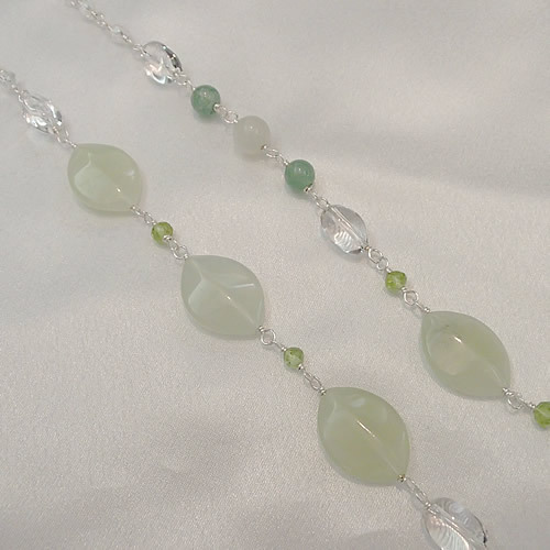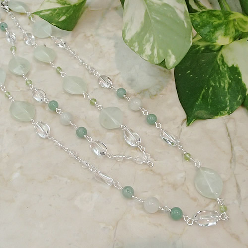 サーペンチン、アベンチュリン、ペリドットのグリーンカラーの天然石をベースにしたナチュラルな優しいロングネックレス。