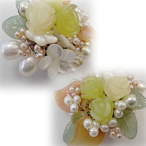 イエロージェイドとサーペンチンのバラ、シェルのプルメリアと、お花型天然石をたくさん使いました。