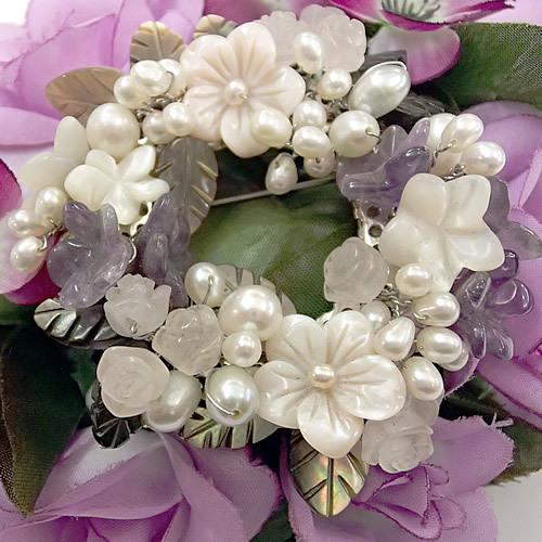 リーフカットされたシェル(ブラックカラー)の中に、ピンクシェルのお花やローズクォーツのバラ、アメシストのお花が入った、ゴージャスな大人ブローチです。