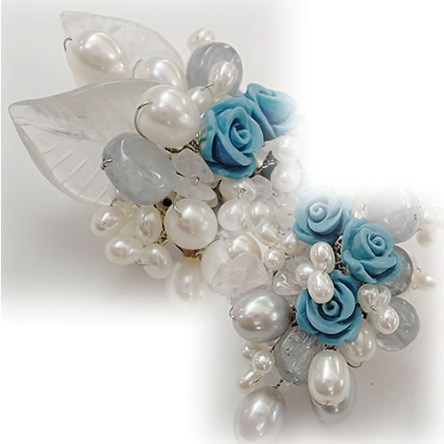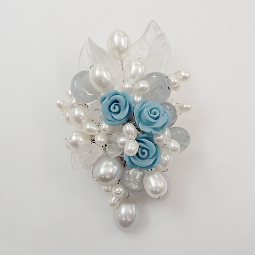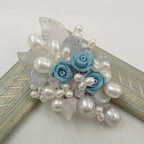 トルコ石のバラをメインに、淡水パールと水晶のリーフを周りにおき、ボリュームたっぷり・爽やかな色合いに仕上がっています。