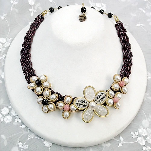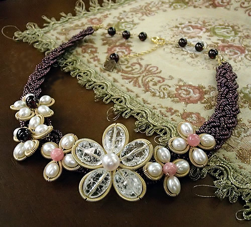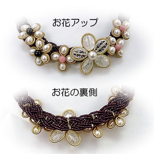 そのサイドに、淡水パール×ガーネットの小さなお花と、淡水パール×インカローズの小さなお花が並んでいます。