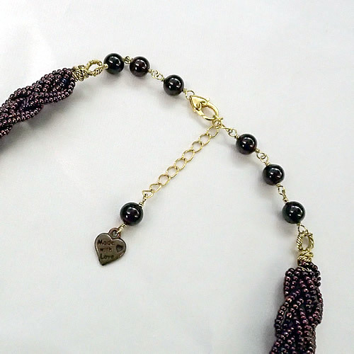 ワインカラーのビーズの四つ編みネックレスがベースになっています。