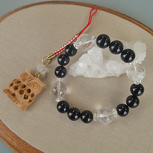 木彫り親子フクロウと水晶がついた縁起の良いストラップ★